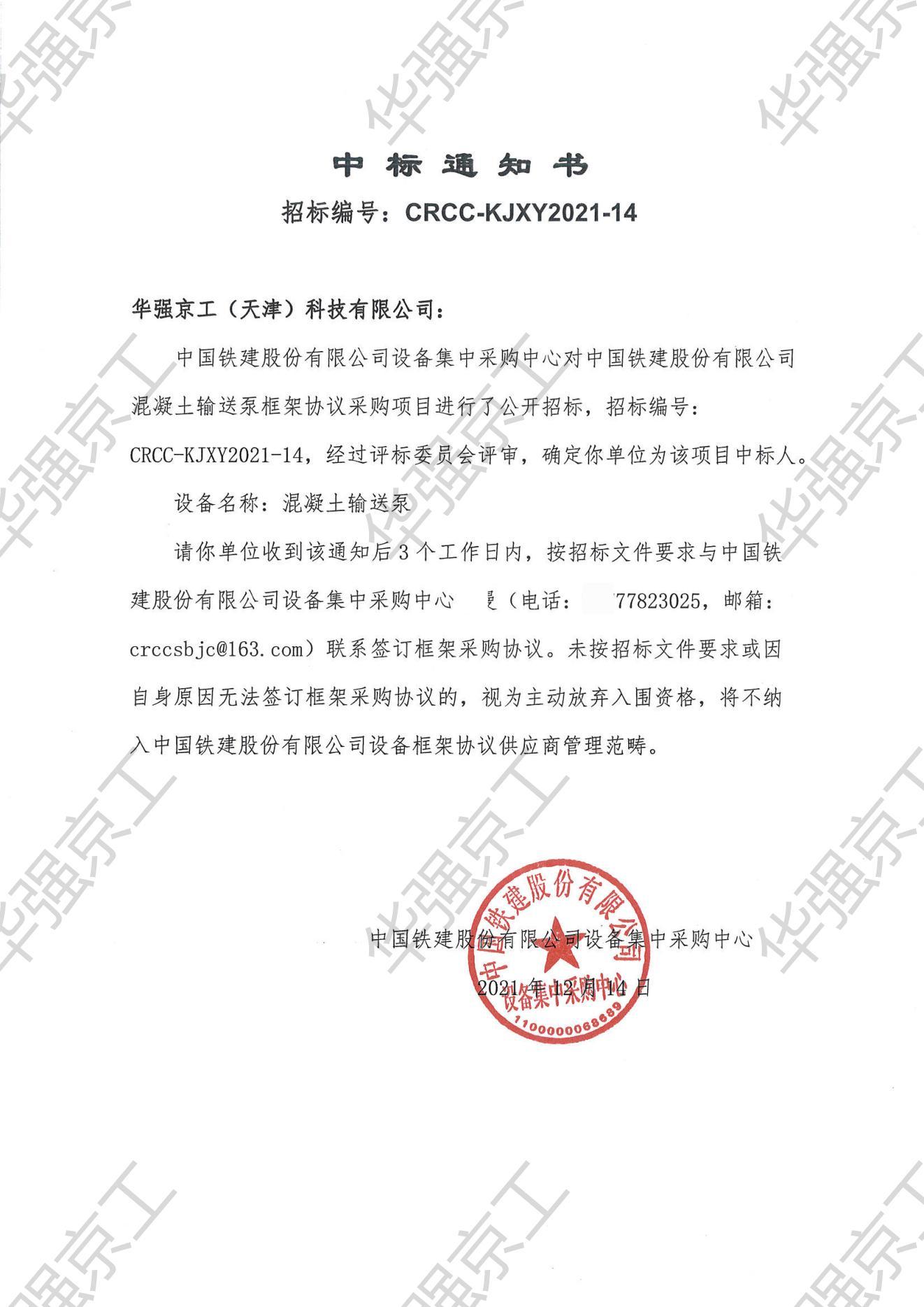 2021年8月,我公司參與了中國(guó)鐵建股份有限公司2021-2023年度設(shè)備框架采購(gòu)項(xiàng)目,并于2021年12月14日成功入圍。此次框架入圍是華強(qiáng)京工自2008年進(jìn)入國(guó)內(nèi)鐵路、高速公路以及國(guó)家特大項(xiàng)目工程建設(shè)以來(lái)自2013年以來(lái)連續(xù)8年入圍中國(guó)鐵建設(shè)備框架集中采購(gòu)入圍名單。